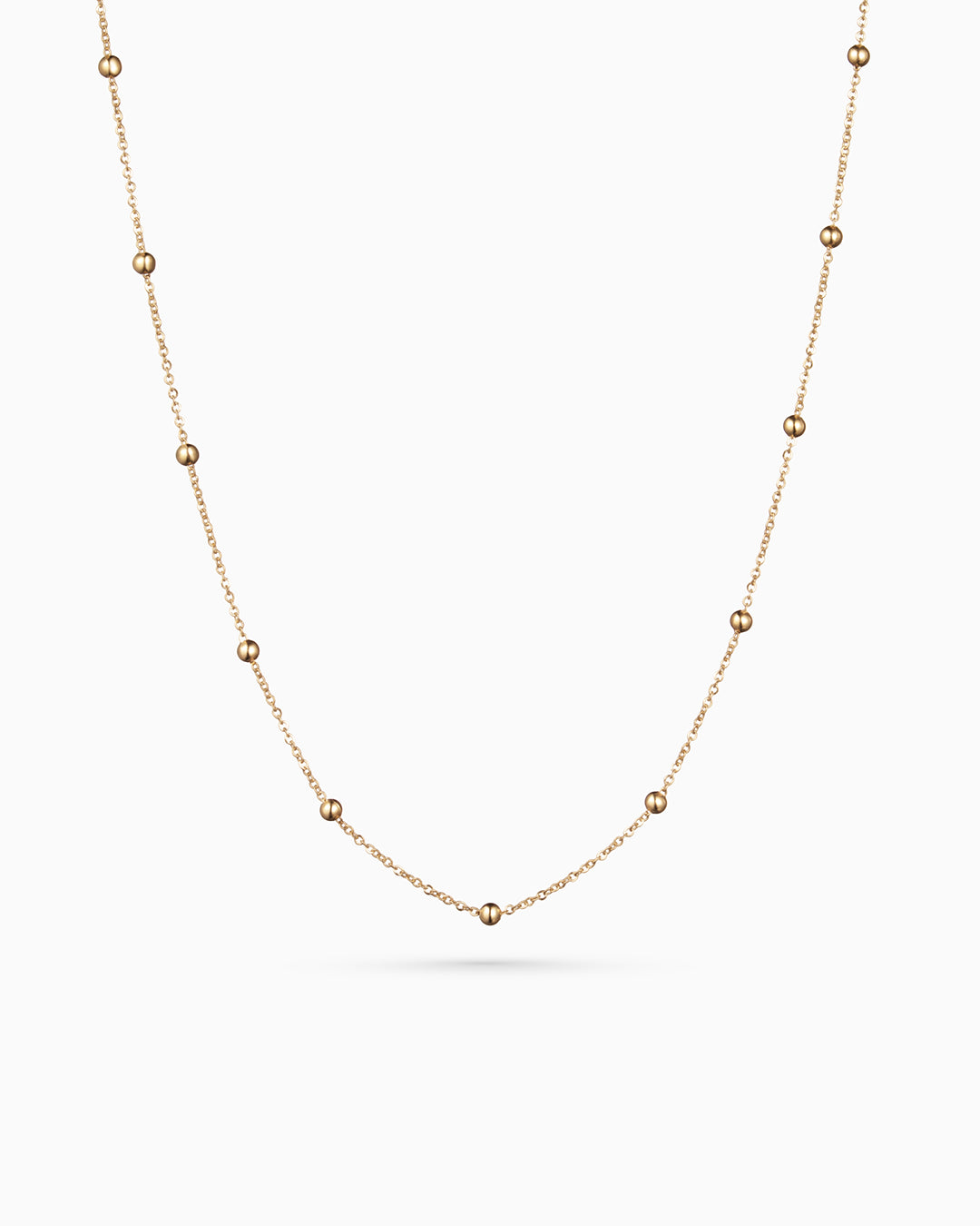O design da corrente Orbit se distingue por uma sequência de delicados elos de ouro 18 quilates combinados com esferas do mesmo material, resultando em uma estética minimalista, mas distinta. Graças ao seu calibre, é uma opção ideal para exibir sua coleção de Luxury Charms, bem como para complementar seus pingentes favoritos. Além disso, sua essência contemporânea dará um toque de frescor às suas combinações de colares em diferentes alturas. Uma joia básica versátil e sofisticada que servirá de base para inúmeros estilos.
