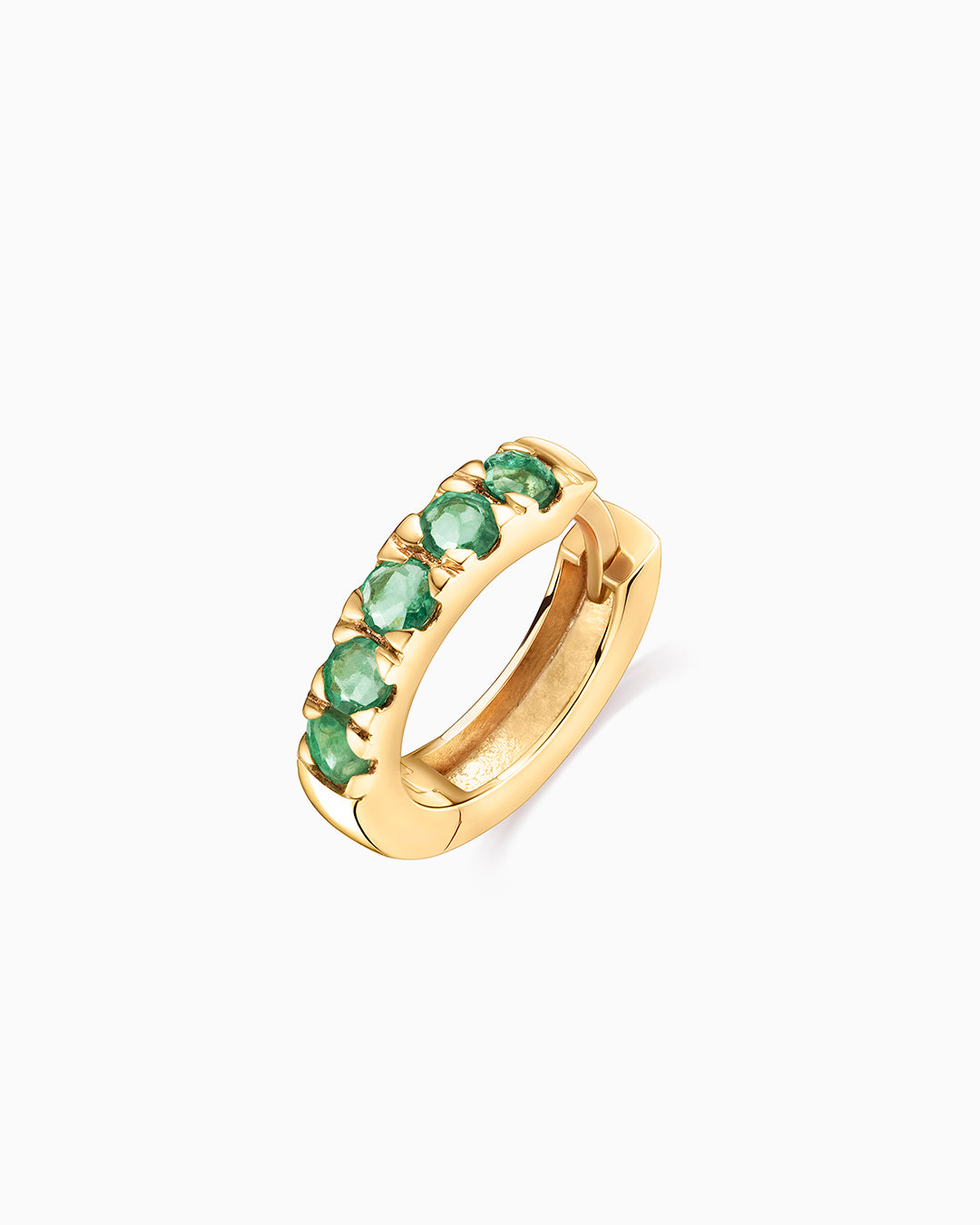 Brinco piercing Eternity Colors Bold com esmeraldas cravejadas em ouro amarelo 18K. Projetado em três cores sublimes, esmeralda, safira e rubi, este piercing é a versão sem diamantes de uma das nossas coleções mais icônicas. Este é um brinco original que é todo sobre cor e positividade. Ele tem um aro um pouco mais largo do que o modelo Eternity Colors Hoop, um detalhe único que lhe dá um ponto diferenciador que você vai adorar. Possui tamanho ideal para se adaptar perfeitamente a qualquer piercing, independente de sua localização. Combine-os com os outros brincos da coleção e crie combinações de cores surpreendentes.O brinco piercing Eternity Colors Bold está disponível em três versões: ouro amarelo com esmeraldas, ouro rosa com rubis e ouro branco 18 quilates com safiras. Junte-se à tendência da moda e revolucione o visual das suas orelhas com Mumit!