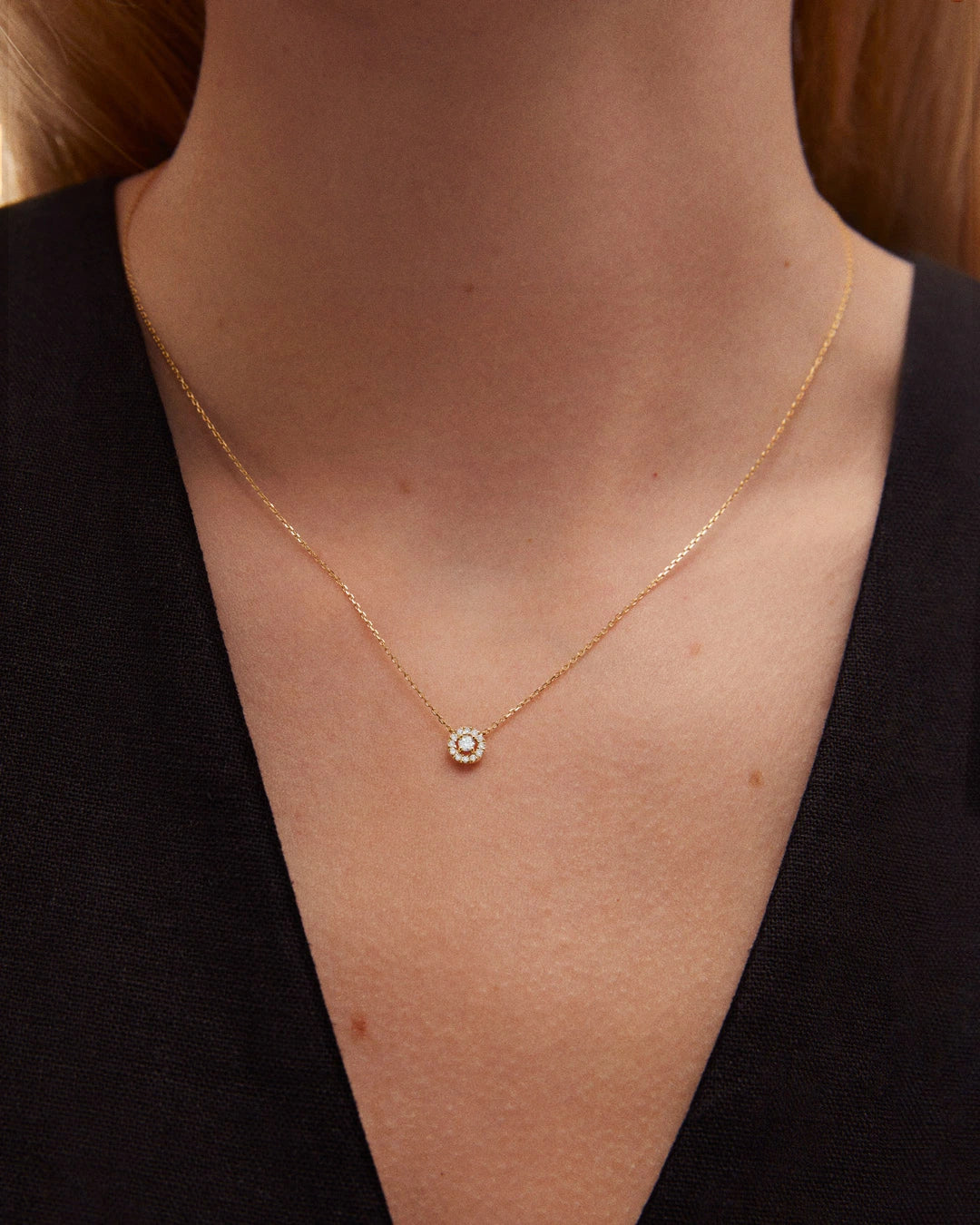 Inspirada na beleza misteriosa do céu noturno, a gargantilha Ariadne funde simbolismo antigo com sofisticação contemporânea. Ariadne, princesa de Creta, ajudou Teseu a escapar do labirinto do Minotauro por meio de uma coroa luminosa. Segundo a lenda, este símbolo de amor e coragem foi posteriormente lançado ao céu, formando a constelação de Corona Borealis. O design da gargantilha reflete o esplendor desta magnífica tiara de estrelas graças a um requintado solitário de lapidação brilhante, acompanhado por um halo de diamantes em forma de círculo concêntrico. O espaço entre a pedra central e o halo de luz que a envolve cria o efeito óptico de uma coroa flutuante, criando uma silhueta etérea e delicada. Feita em ouro 18 quilates, a gargantilha Ariadne é uma homenagem à natureza universal das histórias que contamos para explicar os mistérios do universo e sua conexão com nossas vidas. Uma joia que combina elegância atemporal e brilho eterno, perfeita para revelar os poemas escondidos nas estrelas.