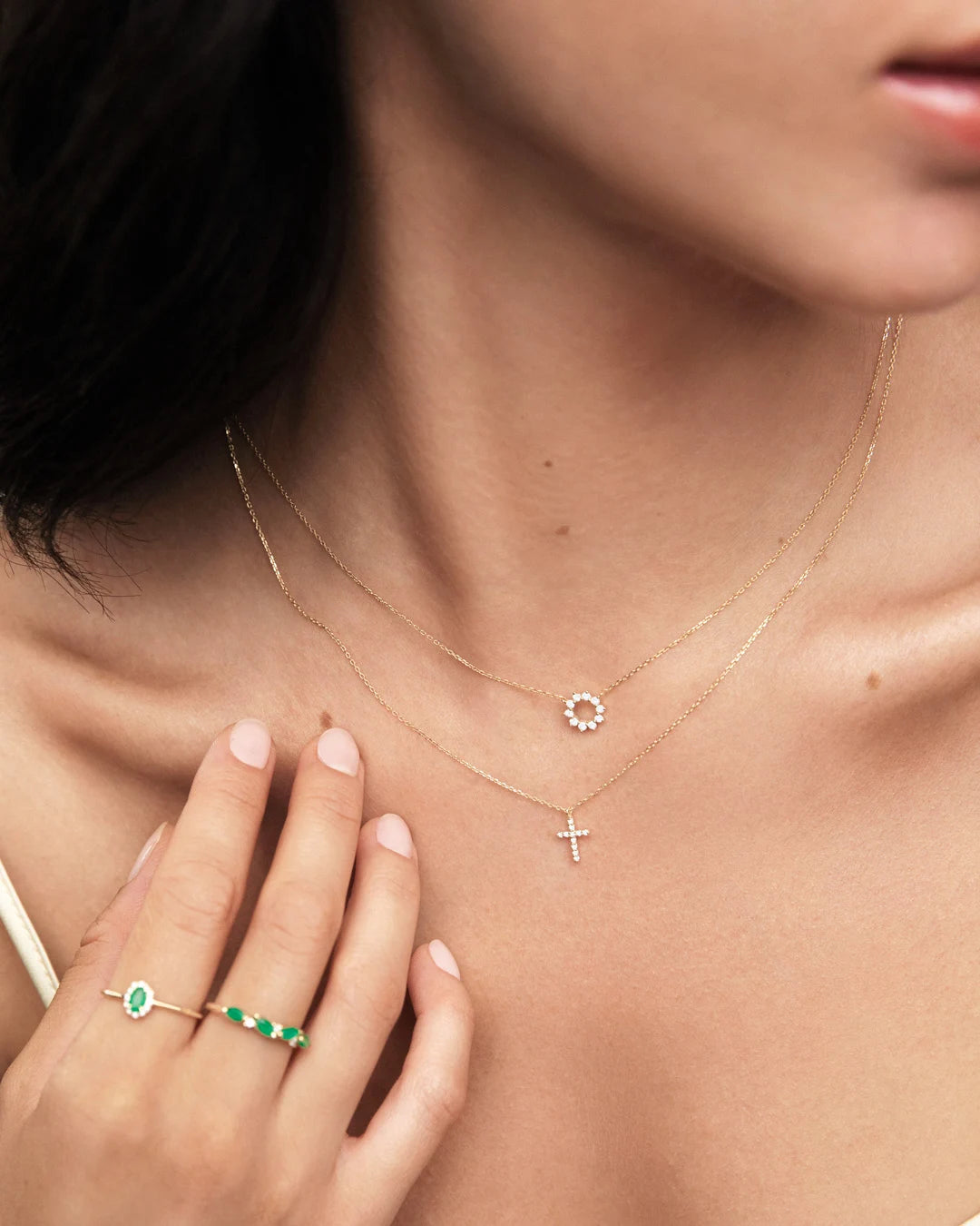 Gargantilha INA Diamond Cross feita em ouro amarelo 18 K. Tradição, artesanato e estética contemporânea se fundem em uma peça fascinante da qual você não vai querer se desfazer. O ícone mais reinterpretado de todos os tempos é capturado em uma gargantilha em forma de cruz de diamante. Esta joia se caracteriza por sua originalidade na configuração que eleva seus onze diamantes facilitando a reflexão da luz, dando origem a uma joia que é toda luz. Esta configuração, criada por Mumit, tem a particularidade de gerar um efeito visual simulando que os diamantes estão flutuando acima do gargalo. Projetada para ser passada de geração em geração, tornando-se um símbolo, a gargantilha INA Cross é um ícone do passado adaptado às tendências de joalheria mais atuais.