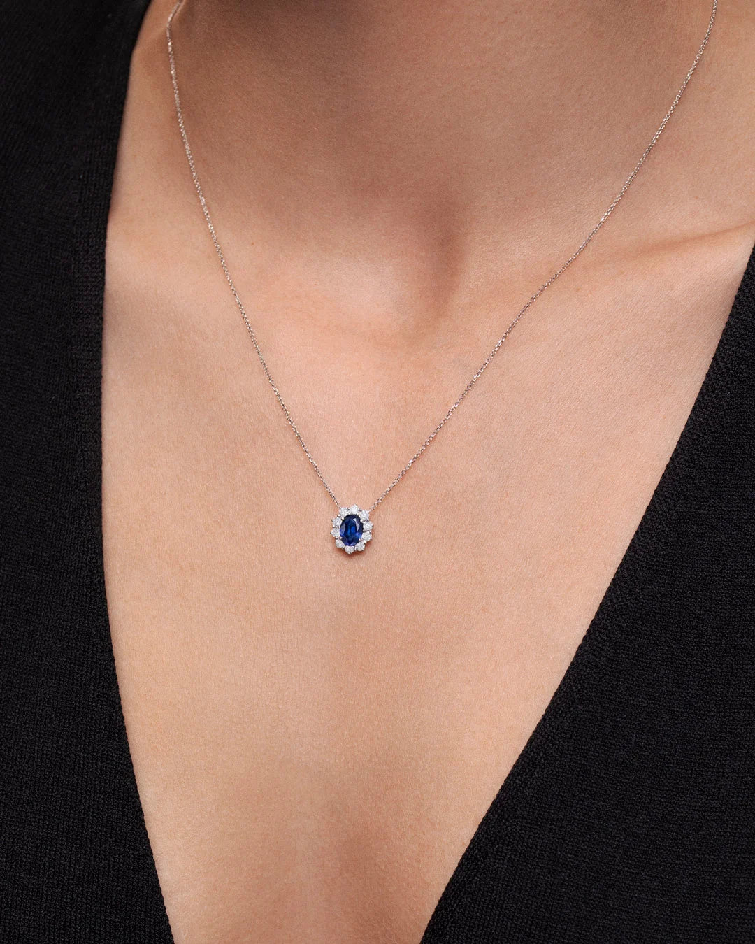 Gargantilha Irem com uma safira oval central e uma borda de diamantes em um engaste de ouro branc...