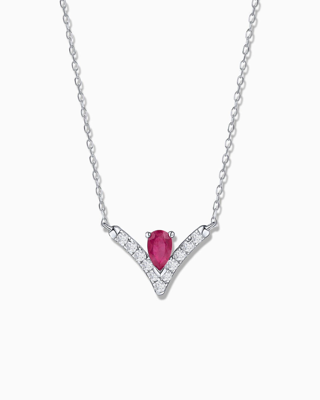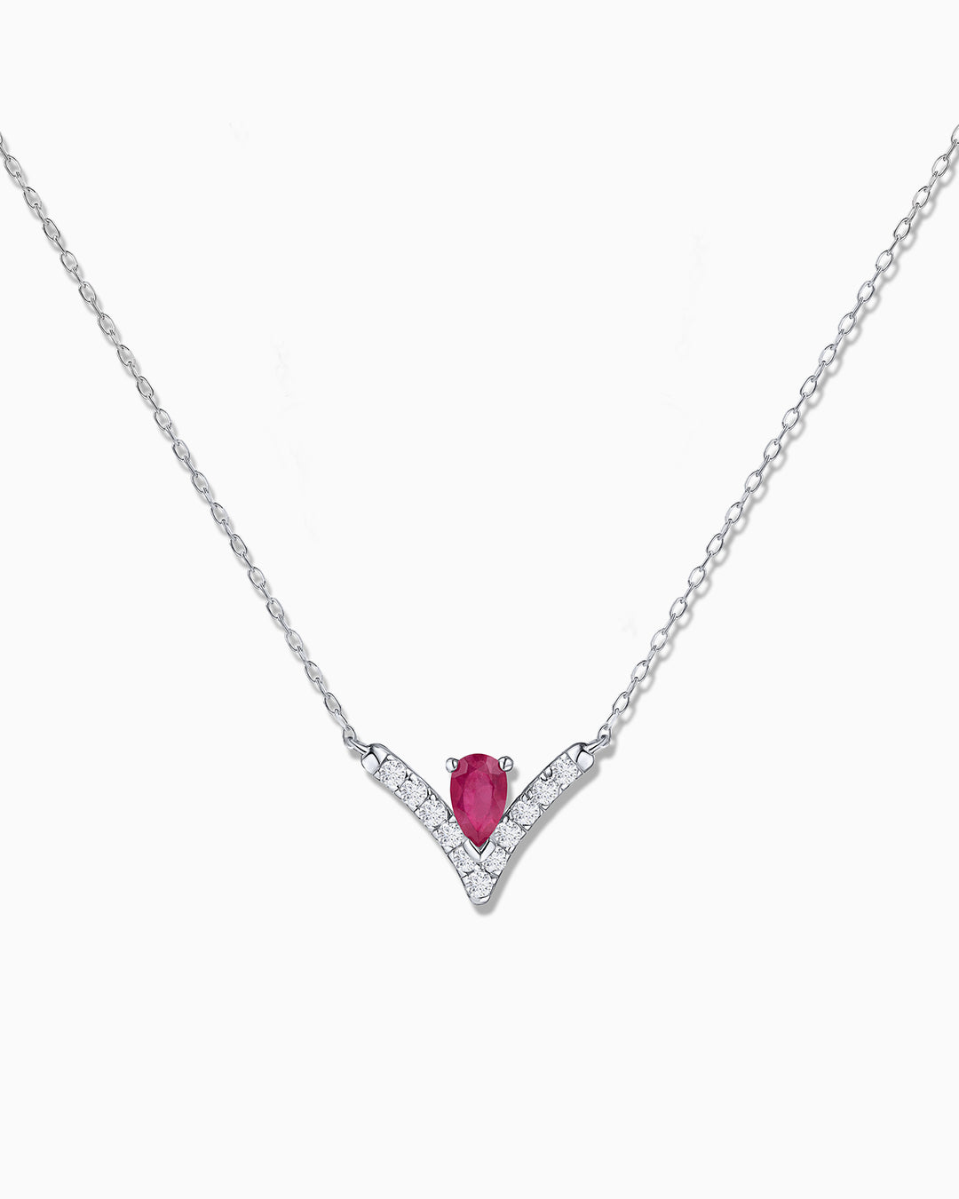 Gargantilha Mia de rubis e diamantes em ouro branco 18K. A gargantilha Mia apresenta delicados diamantes pavê emoldurando um rubi em formato de lágrima, realçando a cor e a curvatura desta magnífica pedra preciosa. O corte pera combina a suavidade da base da gema com uma ponta afiada que se funde perfeitamente à silhueta do anel, resultando em uma interação de linhas estilizada e cativante. Além disso, por trás do design peculiar desse tipo de pingente em formato de V existe uma tradição que o associa à boa sorte, tornando-o uma escolha ideal para um presente cheio de significado. Descubra um legado de elegância e prosperidade atemporais com a coleção Mia da Mumit.