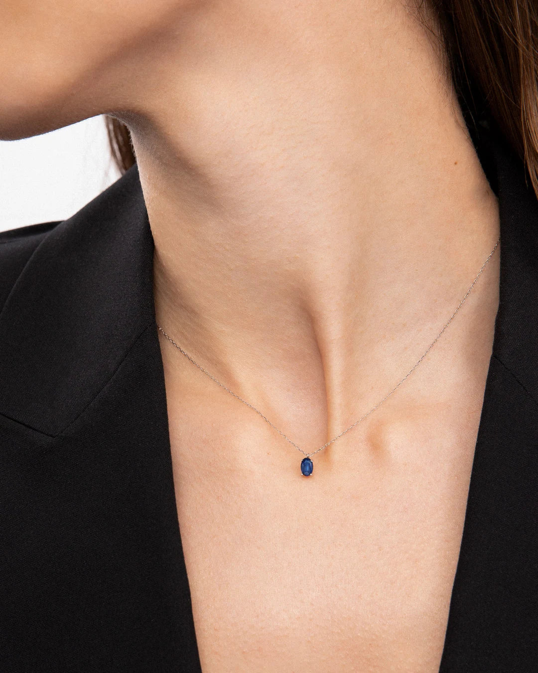 Gargantilha de safira com lapidação oval montada em ouro branco 18 quilates. A coleção Essentials in Colors está se expandindo com um novo design que reinventa a gargantilha oval esmeralda original. A essência minimalista com seu toque de modernidade que caracteriza toda a coleção também se reflete nesta delicada joia. Seu elemento central, a intensa safira de lapidação oval montada em um engaste invisível, é conectada à corrente por um delicado anel, promovendo seu movimento. Combina o tom azul da safira com o frescor do ouro branco 18K, fazendo-o brilhar de uma forma única. É uma gargantilha ideal para dar um toque de cor ao pescoço ou para combinar com outras gargantilhas da coleção, criando um jogo de cores.
