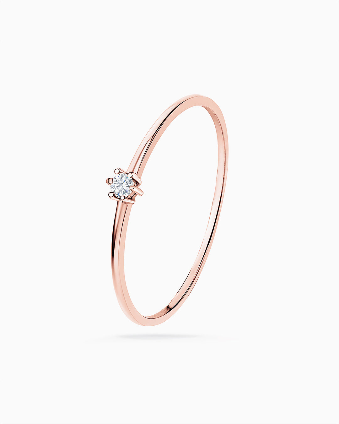 Paciência Petite Diamonds. Anel solitário de diamante em uma configuração de seis garras feito de ouro rosa 18 quilates. Seu design delicado e fino faz desta maravilhosa joia um item básico para usar em qualquer ocasião. Este solitário se tornará o item essencial que você estava procurando em sua caixa de joias. Um diamante de 0,025 quilates engastado em um lindo engaste de seis garras é o detalhe que dá a esta joia seu toque característico de exclusividade e elegância. O solitário Petite Diamonds será o companheiro inseparável de todos os seus anéis.O solitário Petite Diamonds está disponível em três versões: ouro amarelo, rosa e branco de 18 quilates.