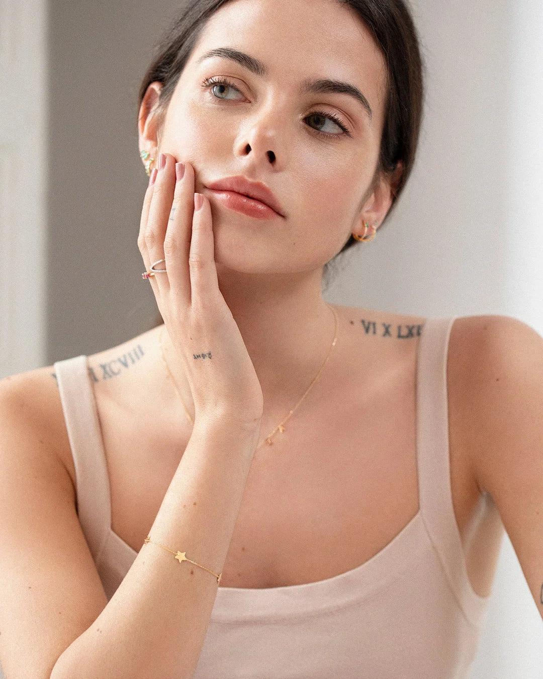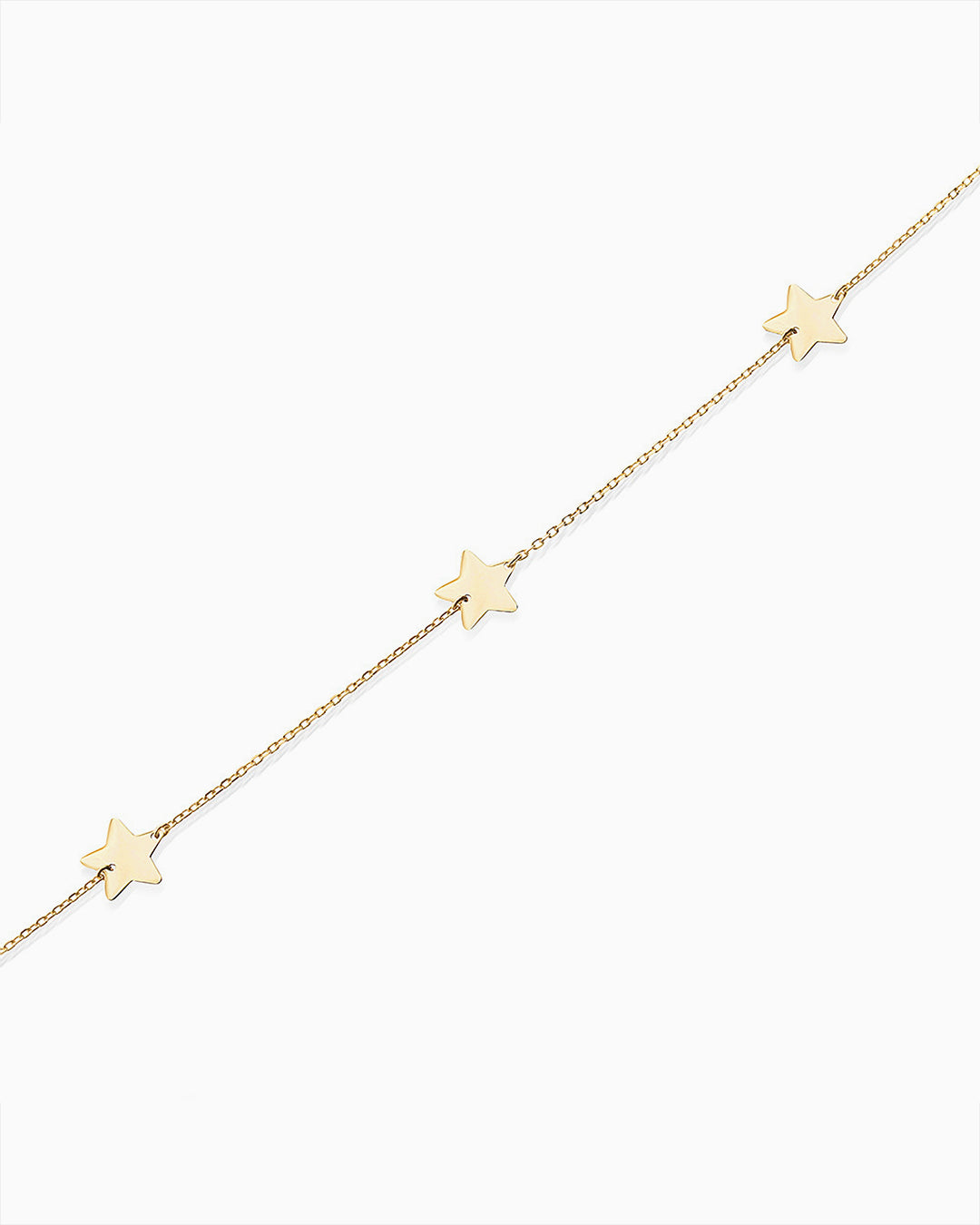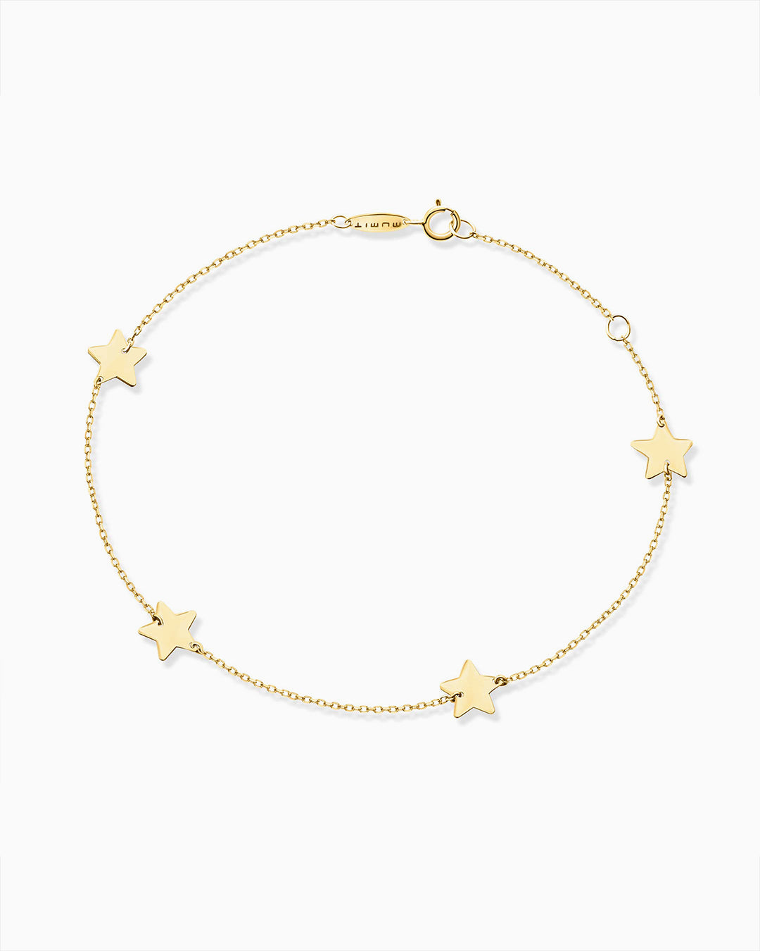 A pulseira Stars em ouro amarelo 18K é um dos itens básicos da Mumit que se tornará parte essencial do seu dia a dia. Esta é uma pulseira de tamanho médio que se ajusta perfeitamente a qualquer pulso graças ao seu fecho de mola com extensão e ao seu comprimento de 19,5 cm. É composto por quatro estrelas de cinco pontas que traçam delicadamente o desenho original da pulseira. Uma joia versátil que oferece infinitas possibilidades de combinação e é ideal para usar com a Star Choker.