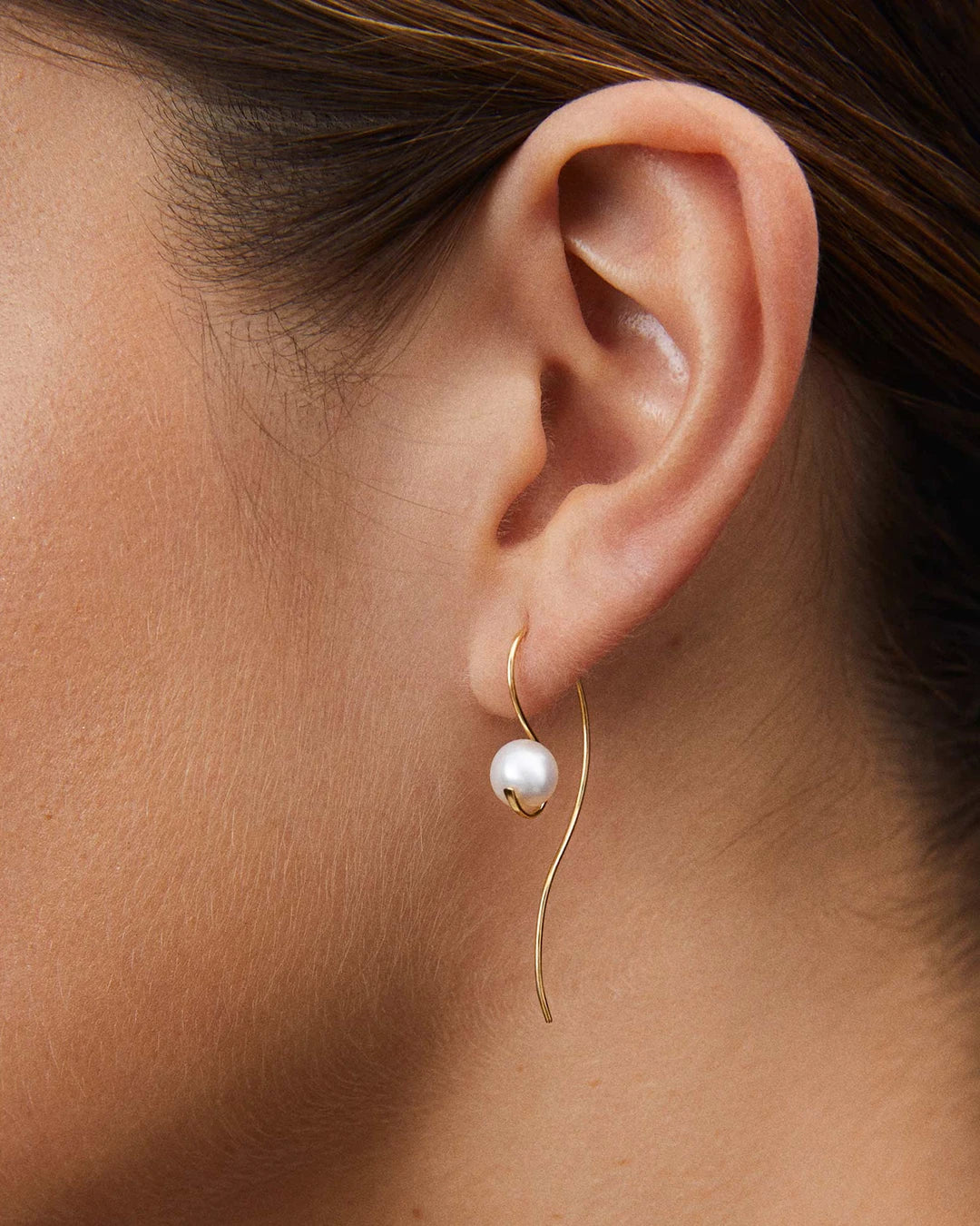 Brincos Love Pearls feitos em ouro amarelo 18 K. Inspirados nos mistérios ocultos da tradição japonesa, os brincos Love Pearls em ouro amarelo 18 quilates se tornarão um item essencial que você não tirará do corpo. Uma delicada pérola flutuante é a protagonista deste design misterioso com um ar de tradição onde a delicadeza se transforma em beleza. Esses brincos foram moldados à mão para atingir seu formato sinuoso característico.