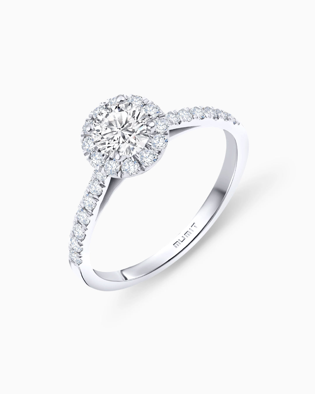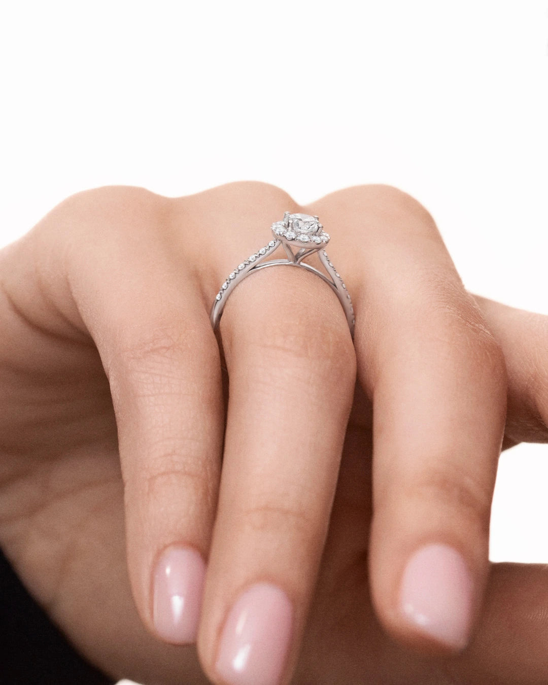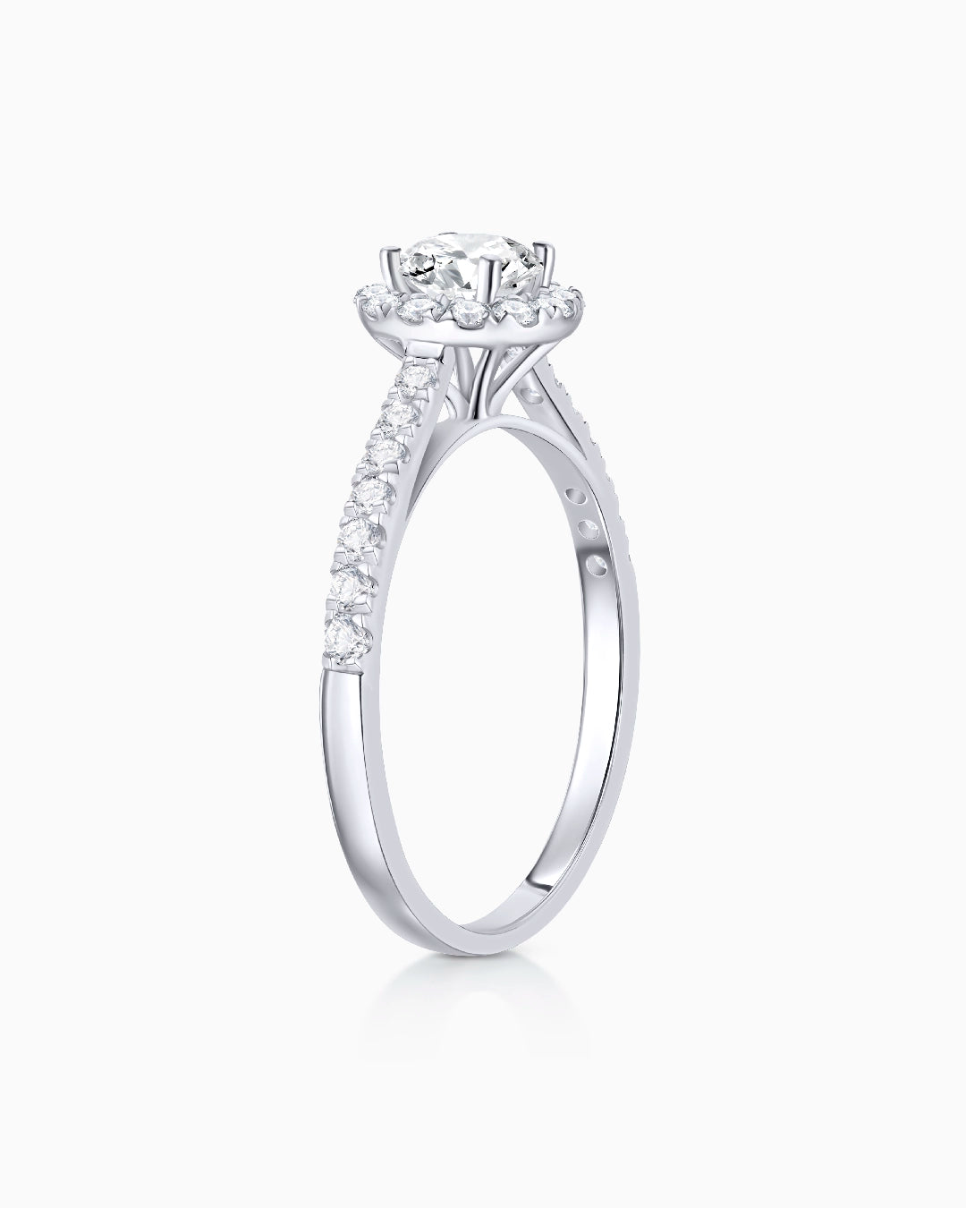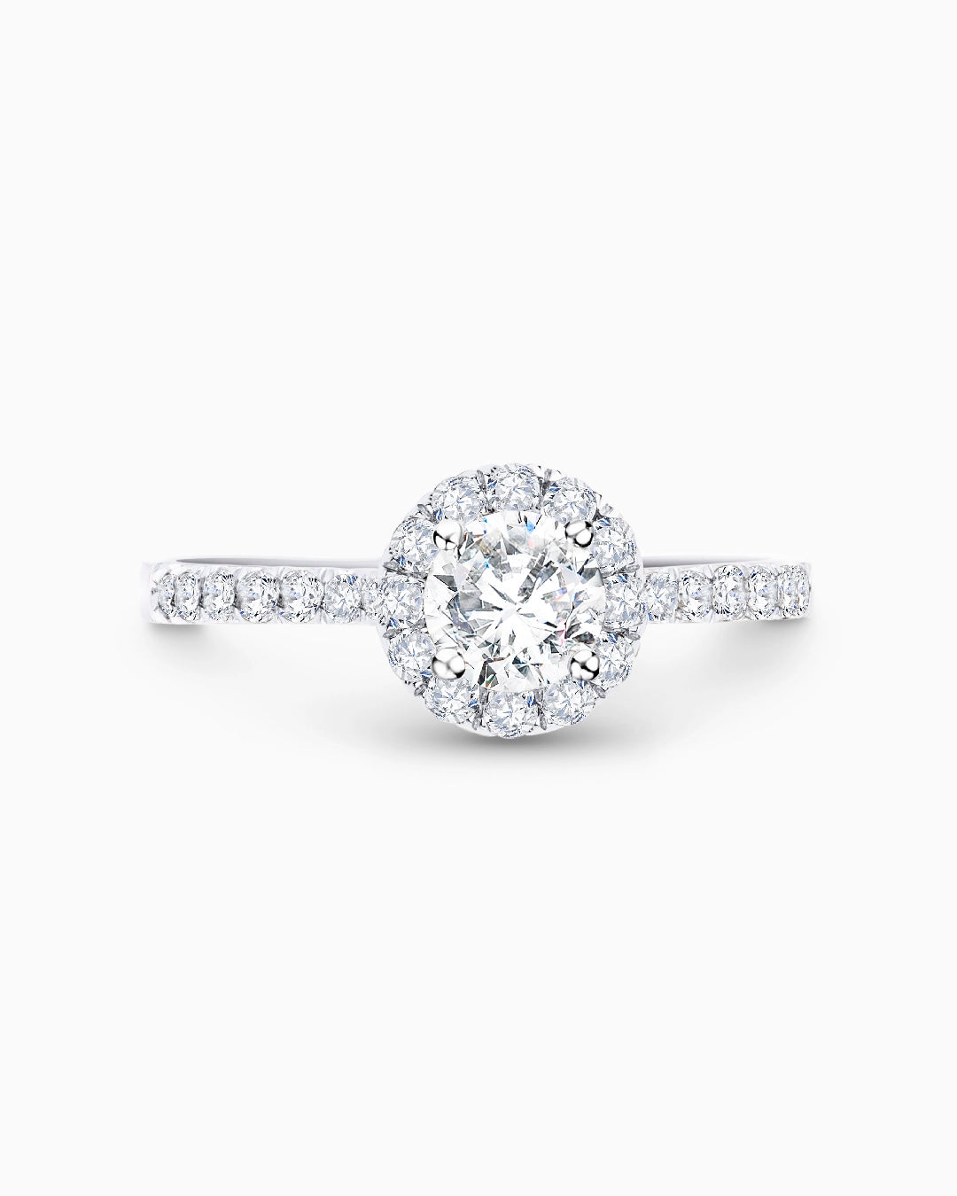 Solitário Rosalind com diamantes em ouro branco 18 quilates. O exclusivo solitário Rosalind tem uma personalidade nitidamente romântica. Ele foi projetado para celebrar a feminilidade e a beleza atemporal através do show de luzes oferecido por seu extraordinário conjunto de diamantes. Seu design se distingue por arcos elegantes de linhas arquitetônicas que elevam o diamante central de 0,5 quilate a uma altura surpreendente, permitindo que ele capture cada raio de luz. Uma borda de diamantes evocando as delicadas pétalas de uma rosa e o pavé adornando os braços complementam e acentuam o brilho do diamante principal, criando um anel que será o centro das atenções. Deixe que esta joia cheia de alma conte sua história.